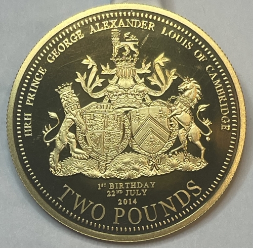 Золотая монета 2 фунта "Годовщина рождения принца Джорджа Уэльского" 2014г., Au 917, 16,171г.