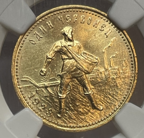 Золотая монета Червонец Сеятель 1923 г. в слабе NGC MS 64