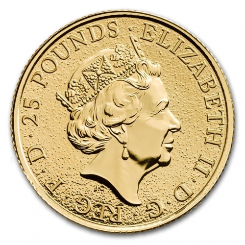 • Золотой Королевский Гриффон это вторая золотая монета в серии "Звери королевы" Монета 2017 года номиналами в 100 и 25 фунтов и весом в 1 и 1/4 тройскую унции. Монета продолжает серию десяти геральдических статуях, связанных с родословной королевы Елизаветы II.  Монета Королеский Гриффон Эдварда III состоит из геральдического зверя, находящегося над щитом, на котором изображены знаки связанные с королем Эдуардом III.  Щит стоит по центру монеты с циркулирующей надписью на левой стороне - GRIFFIN OF EDWARD III. Монета разработана Королевским монетным двором Великобритании, художник Джоди Кларк. Вес 1/4 унции составляет 7,8 грамма и диаметром 22 мм, при номинале 25 фунтов. Чистота золотых монет 999,9.